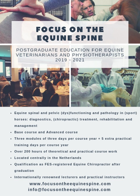 Over the years, ´Focus on the Equine Spine´ has provided postgraduate education for veterinarians and registered equine physiotherapists from several countries in Europe, among which Sweden, Denmark, Finland, Norway, Germany, Belgium, Italy, France, Spain and the Netherlands, in which FES is based. In all of these countries the program of FES was acknowledged as part of the continuing accreditation for both veterinarians and equine physiotherapists. for more information, please visit www.focusontheequinespine.com or send an e-mail to info@focusontheequinespine.com